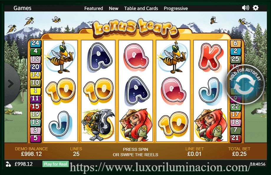 Bonus Bear menampilkan latar hutan hijau, pohon berbuah, dan sungai berkilau, lengkap dengan simbol beruang dan harta keberuntungan. Simbol yang muncul di gulungan meliputi: