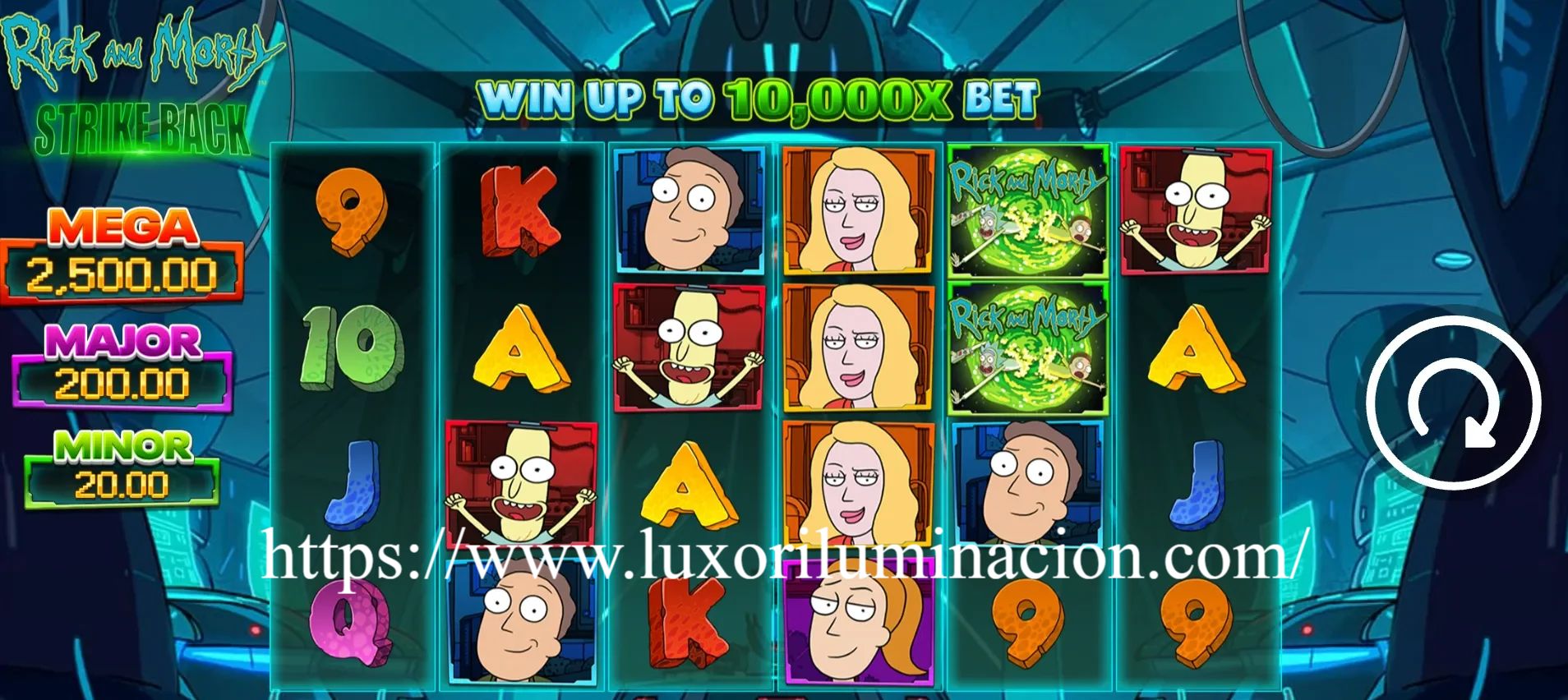 Rick and Morty Strike Back menampilkan latar dimensi alternatif dengan portal neon, makhluk aneh, dan gadget futuristik. Simbol-simbol yang hadir antara lain: